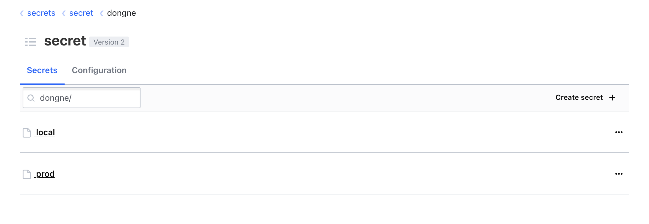 local, prod 둘 다 저장하면 위와 같이 환경별로 secret 정보들을 깔끔하게 관리할 수 있습니다.