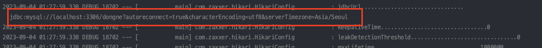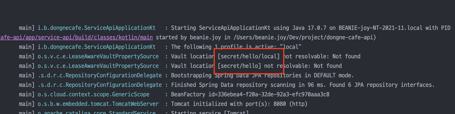 설정을 마치고 애플리케이션을 실행하면 프로젝트에 따로 jdbc-url을 설정한 적이 없는데 vault에 있는 secret 내용을 가져와서 설정이 된 것을 확인할 수 있습니다.