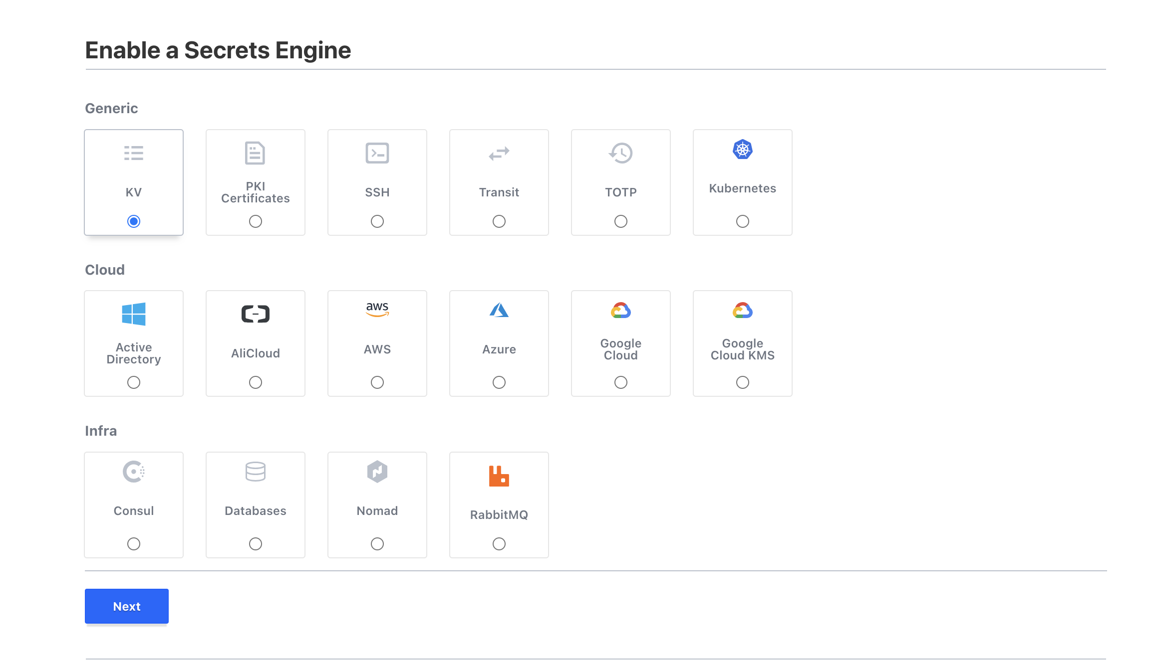 Generic > KV를 선택하시고 다음으로 넘어갑니다. KV는 vault의 Key-Value 형식 저장소를 의미하고 임의의 secret 정보들을 key value 형태로 저장하게 됩니다.