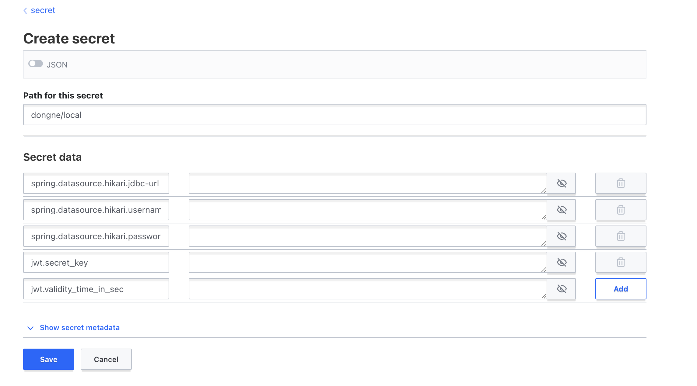 path에는 dongne/local로 지정하고 secret data에는 key value 형식에 맞춰 application.yml에 적용하고자 하는 설정내용들을 입력하면 됩니다.