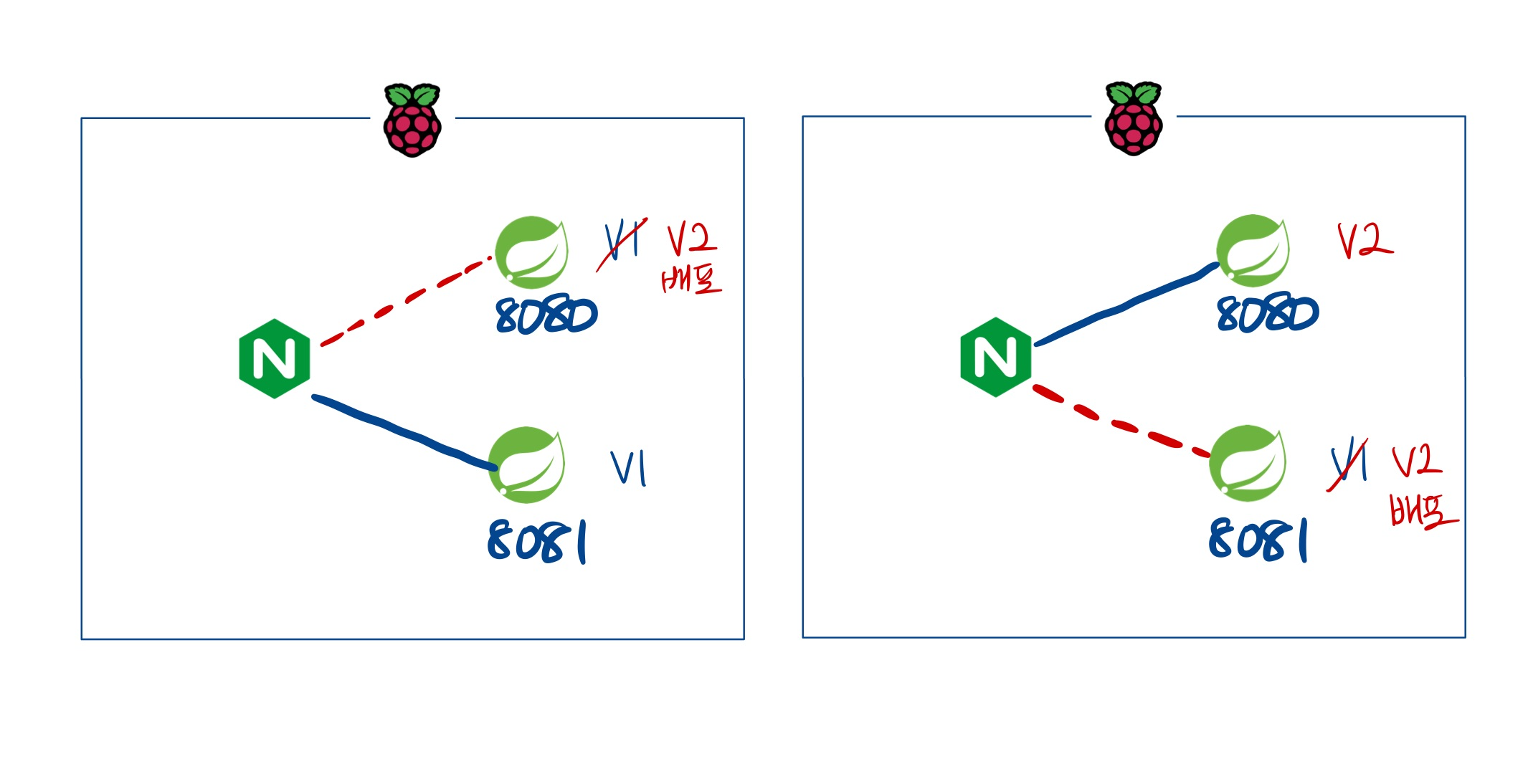 위의 내용을 다시 적어보았는데요. 8080 포트부터 배포를 진행하고, 8081 포트도 동일한 과정으로 배포를 진행하게 됩니다. 그림으로 간략하게 묘사하자면 다음과 같습니다.