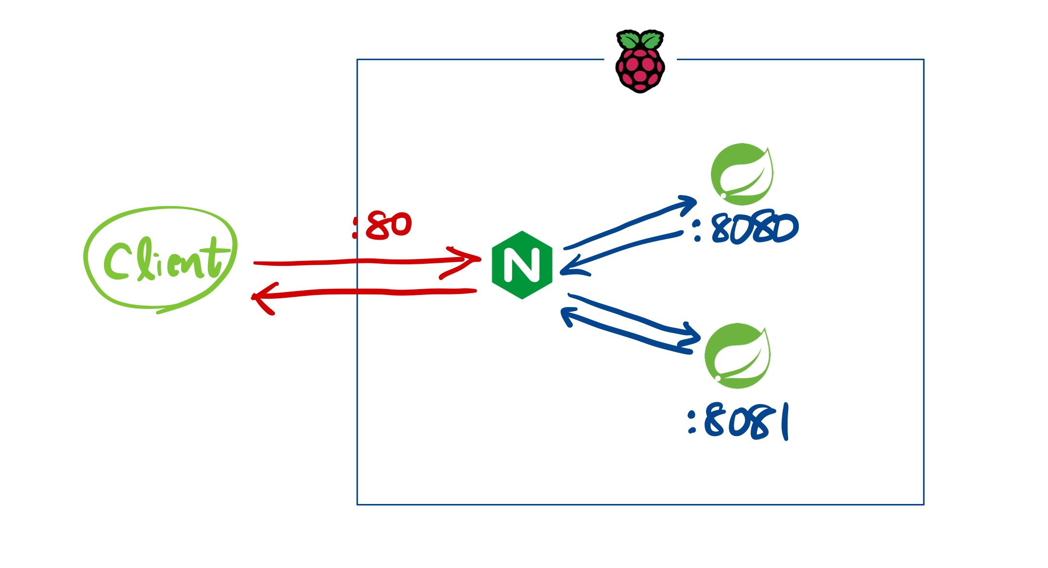 클라우드 서버 리소스 비용이 무지막지해서 개인적으로 구매한 라즈베리파이 하나에 포트로 구분된 애플리케이션 2개를 띄어서 nginx를 이용해 load balancing하는 아주 간략한 구조로 세팅했습니다.