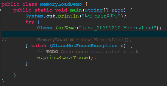 1 2 3 4 5 6 7 8 9 10 11 12 13 14 15 16 17 18 19 | public class MemoryLoadDemo { public static void main(String[] args) { System.out.println("나는 main이다."); try { Class.forName("java_20191210.MemoryLoad").newInstance(); } catch (ClassNotFoundException e) { // TODO Auto-generated catch block e.printStackTrace(); } catch (InstantiationException e) { // TODO Auto-generated catch block e.printStackTrace(); } catch (IllegalAccessException e) { // TODO Auto-generated catch block e.printStackTrace(); } } } |