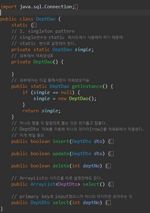 DTO는 dept 테이블의 칼럼 (deptno, dname, loc)에 대해서 맴버변수화시키고 각 맴버변수에 대해서 setter & getter를 만듭니다. 이렇게 만들어두면 DTO객체를 가지고 테이블의 데이터 하나(혹은 새로 테이블에 담을 데이터)를 담고 그걸가지고 위의 DAO 객체가 이용하는 방식이 가능해집니다.