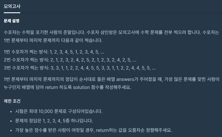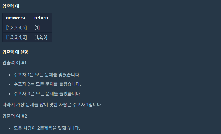 이번 문제는 가장 많이 맞춘 사람들만 반환하는 것이기 때문에 그나마 다행인데 한 개 이상 맞춘 수포자를 맞춘 개수로 내림차순 정렬해서 반환하는 것도 생각해봤는데 상당히 어렵더라구요... 고민해봐야할 또 다른 문제인 것 같습니다.