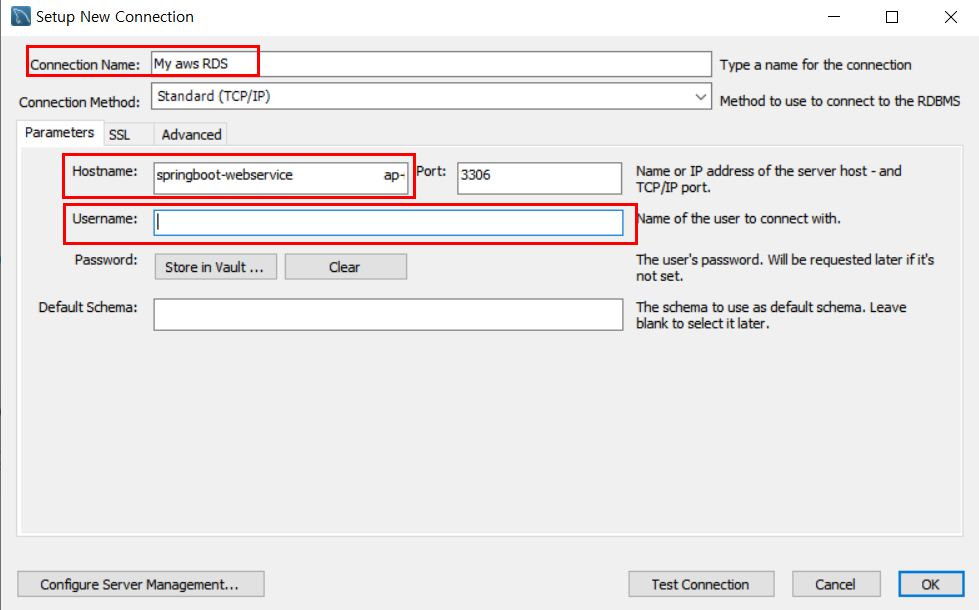 - Username: RDS를 생성할 때 입력했던 username을 넣으면 됩니다.