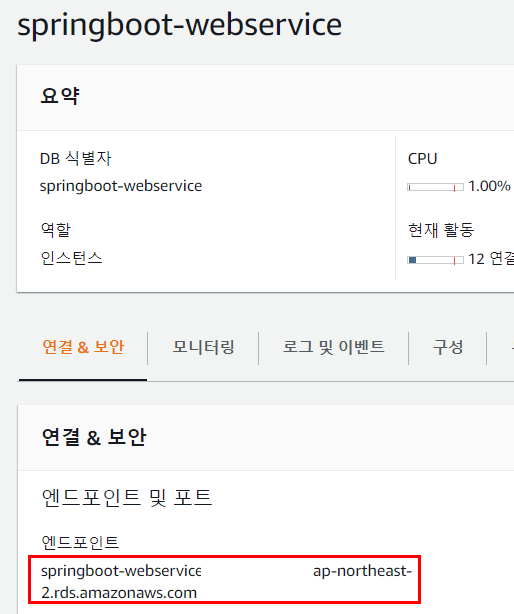 엔드포인트가 일종의 접속 url주소이자 hostname이라고 할 수 있습니다. 이것을 복사해둡시다.