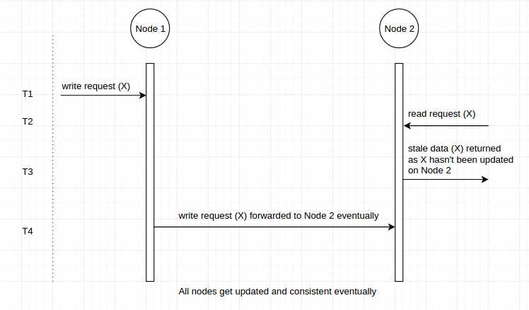 아래 참고자료는 다른 블로그에서 가져온 것인데 EC를 가장 잘 표현하고 있는 그림이라 생각되어 가져왔습니다. 결국 Eventual Consistency의 핵심은 결과론적으로 데이터 일치성을 보장할 것이므로 Node1 DB의 write 작업이 끝나고 Node2 DB로 전파되기 전에 해당 데이터에 대해서 read를 허용한다는 것입니다.