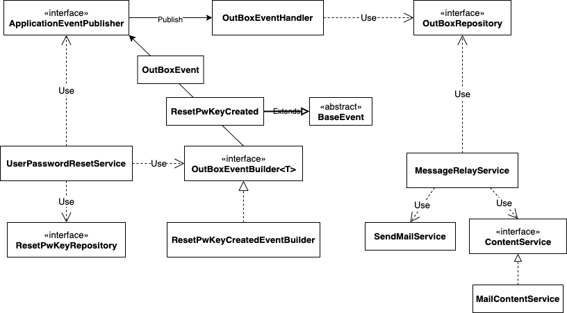 위의 Outbox 패턴을 이용한 메일 발송 서비스를 구현한 코드들의 UML diagram 입니다.
