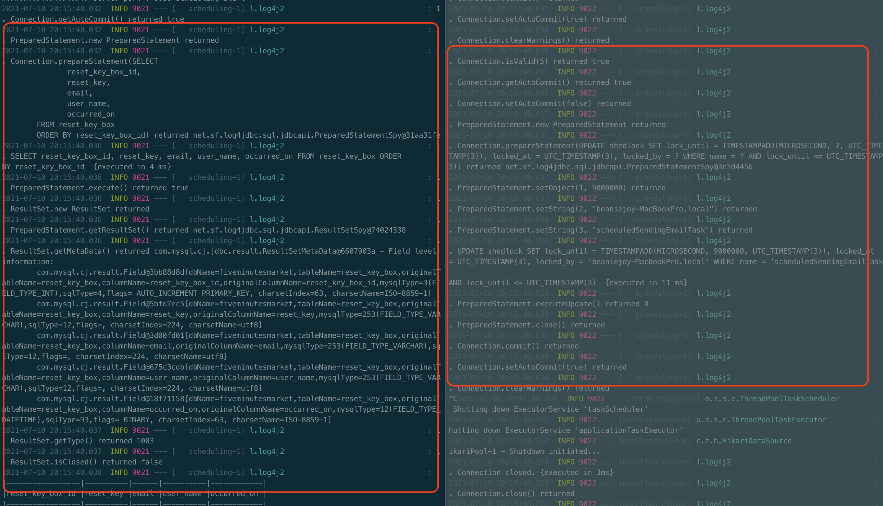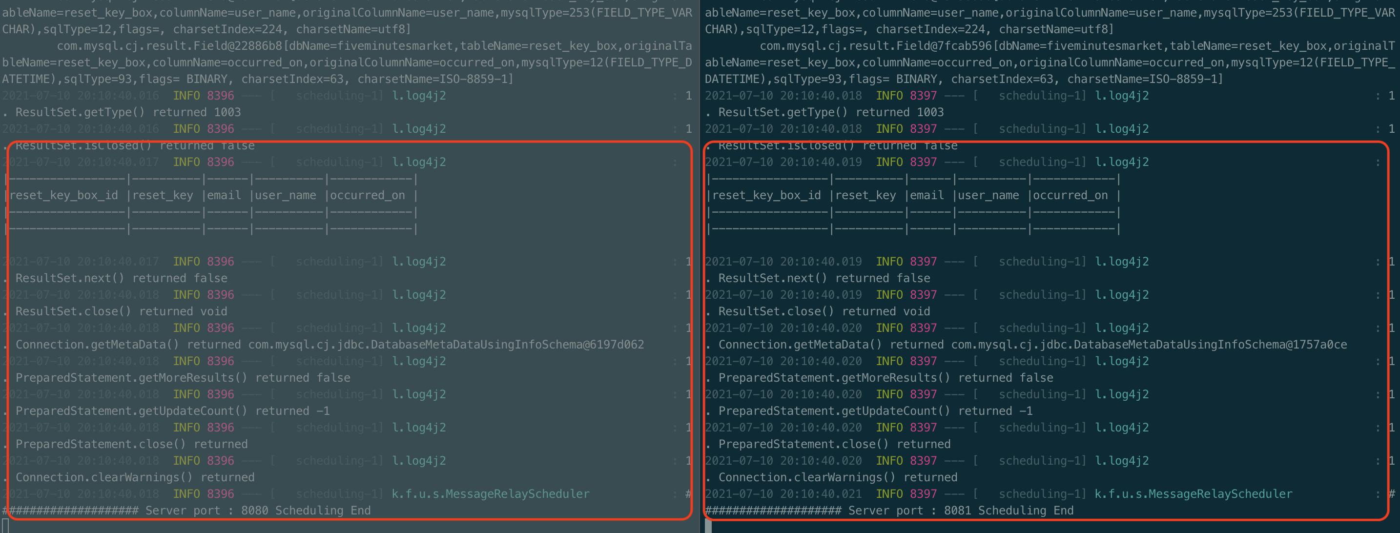 ShedLock 설정 전에 프로젝트를 실행했을 때는 2대의 애플리케이션 서버에서 해당 스케줄러가 거의 동시에 실행되는 것을 볼 수 있었습니다.