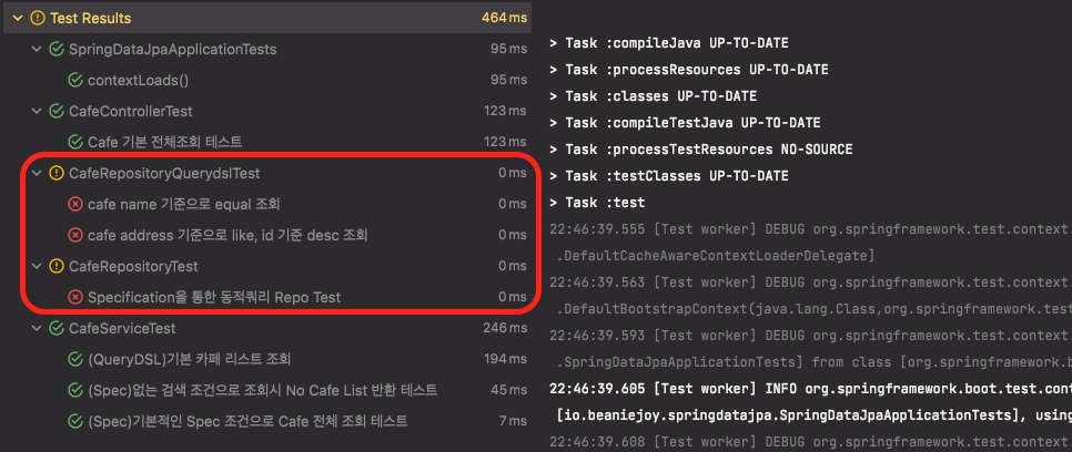 (참고로 사진에 CafeServiceTest의 QueryDSL 기본 카페 리스트 조회 부분은 EntityManager로 테스트하는 것이 아닌 Spring Data JPA를 사용한 구현체를 가지로 테스트하는 부분이라 통과한 것입니다.)