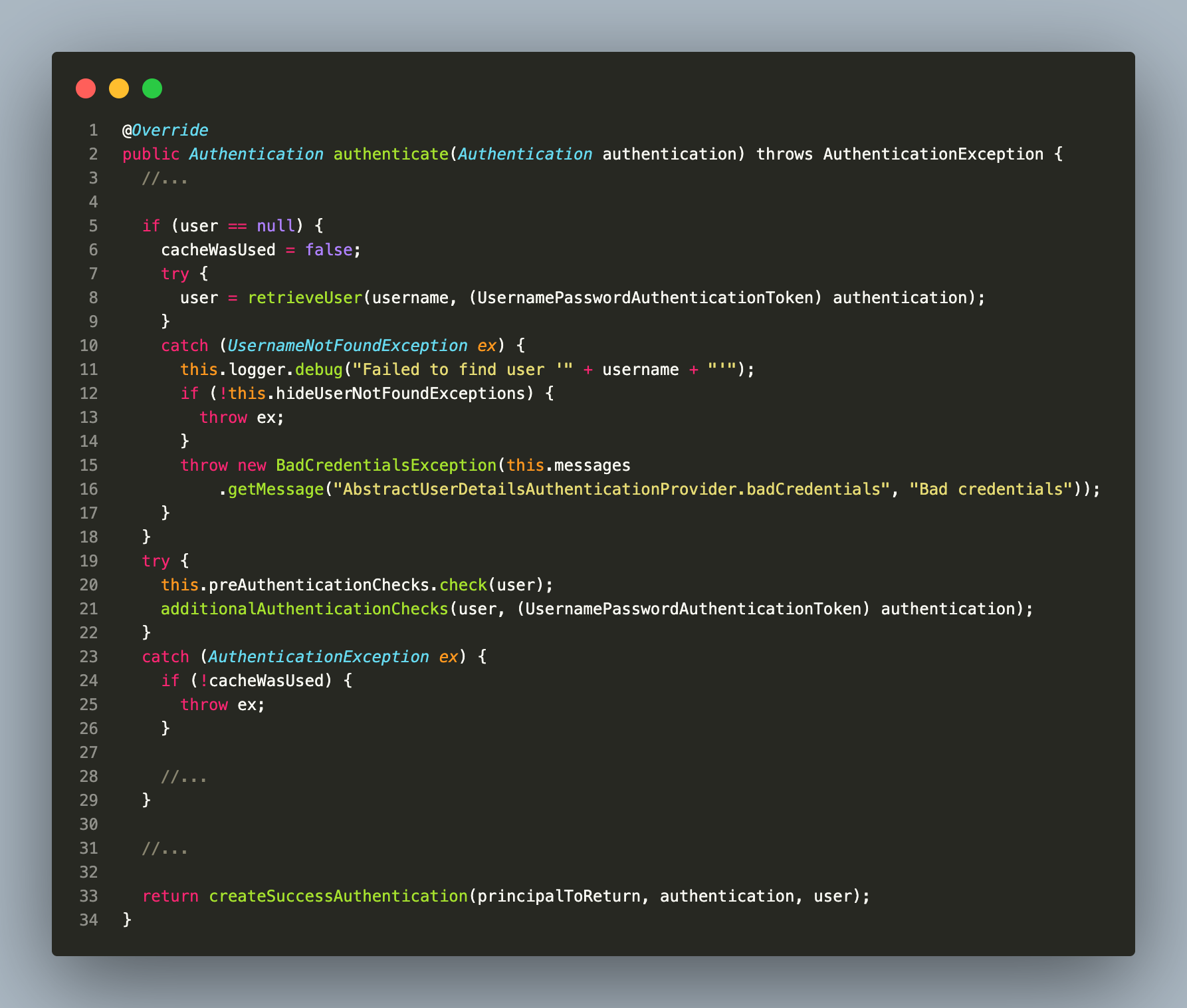 먼저 retrieveUser 메소드를 통해 UserDetailsService 구현체에서 username을 가지고 사용자를 조회해 UserDetails 객체를 받아옵니다. username으로 User 조회에 실패하면 UsernameNotFoundException을 반환하게 됩니다.
