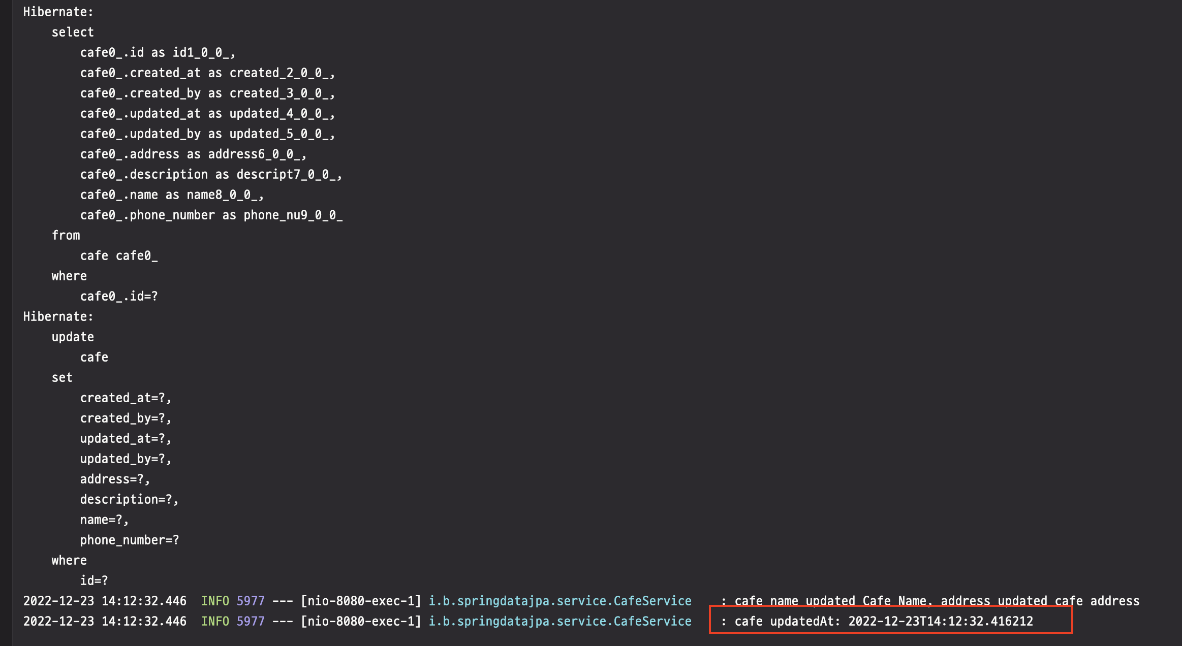 cafeRepository.save(cafe)의 인자로 들어간 cafe의 updatedAt에는 AuditingEntityListener에 의해 현재날짜 값이 담겨질 것이고 그 아래의 log에 찍히게 되는 것이라 할 수 있습니다.