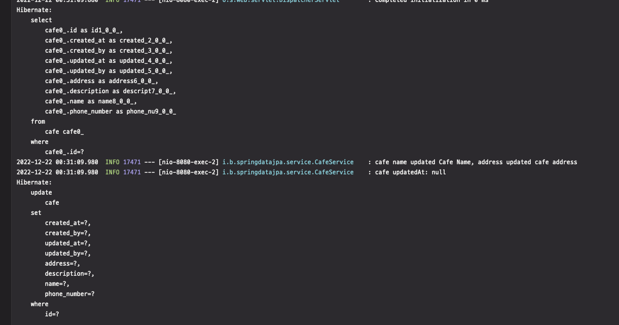 변경된 cafe를 Repository에 save하면서 updatedAt도 현재시간으로 업데이트 될 줄 알았는데 null이 나온 것입니다. 위의 로그를 보면 명확하게 알 수 있는데요. 로그를 찍고나서 그 다음에 실제 update 쿼리가 나간 것을 알 수 있습니다. 왜 그럴까요?