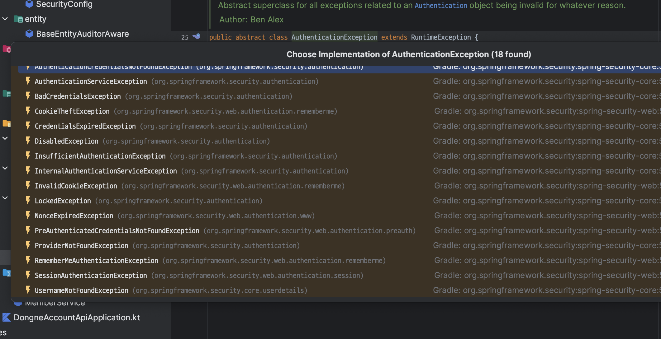 여기서 발생하는 인증 예외는 AuthenticationException이고 이를 상속하는 클래스가 여러 개 있습니다.