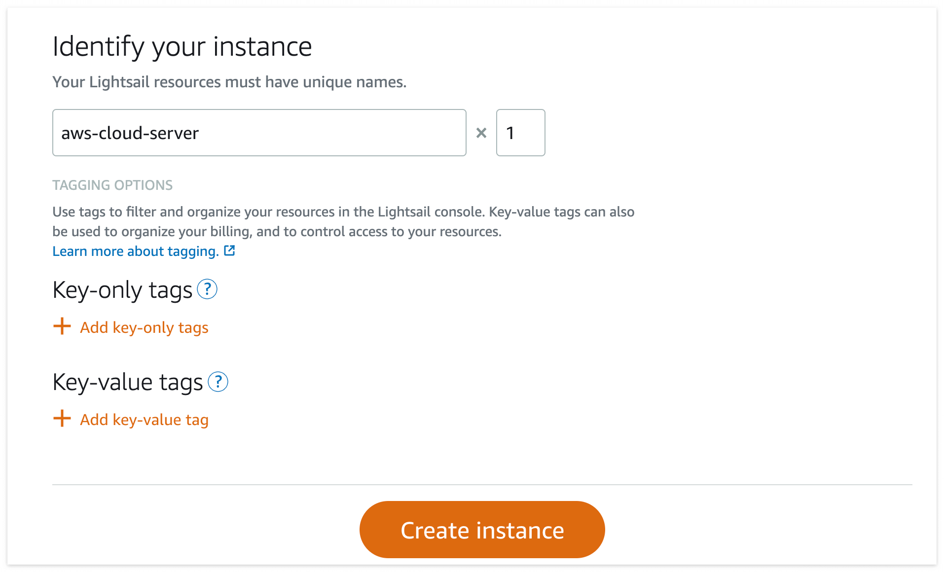 적절한 instance 이름을 지어주시고 create instance를 눌러줍니다. (key-only tags, key-value tags는 생략하셔도 됩니다.)