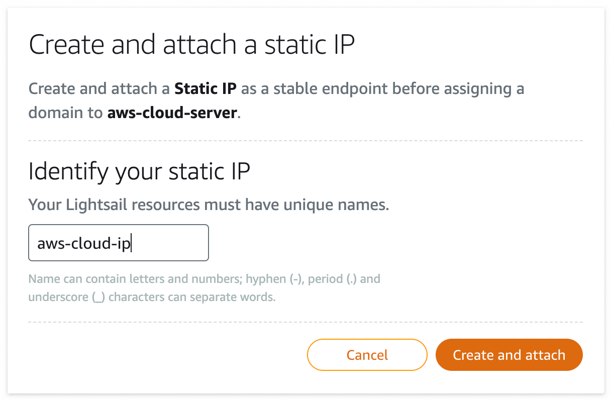 static ip 이름을 지어주고 create and attach 버튼 클릭하면 생성과 동시에 해당 instance public ip에 attach 됩니다.