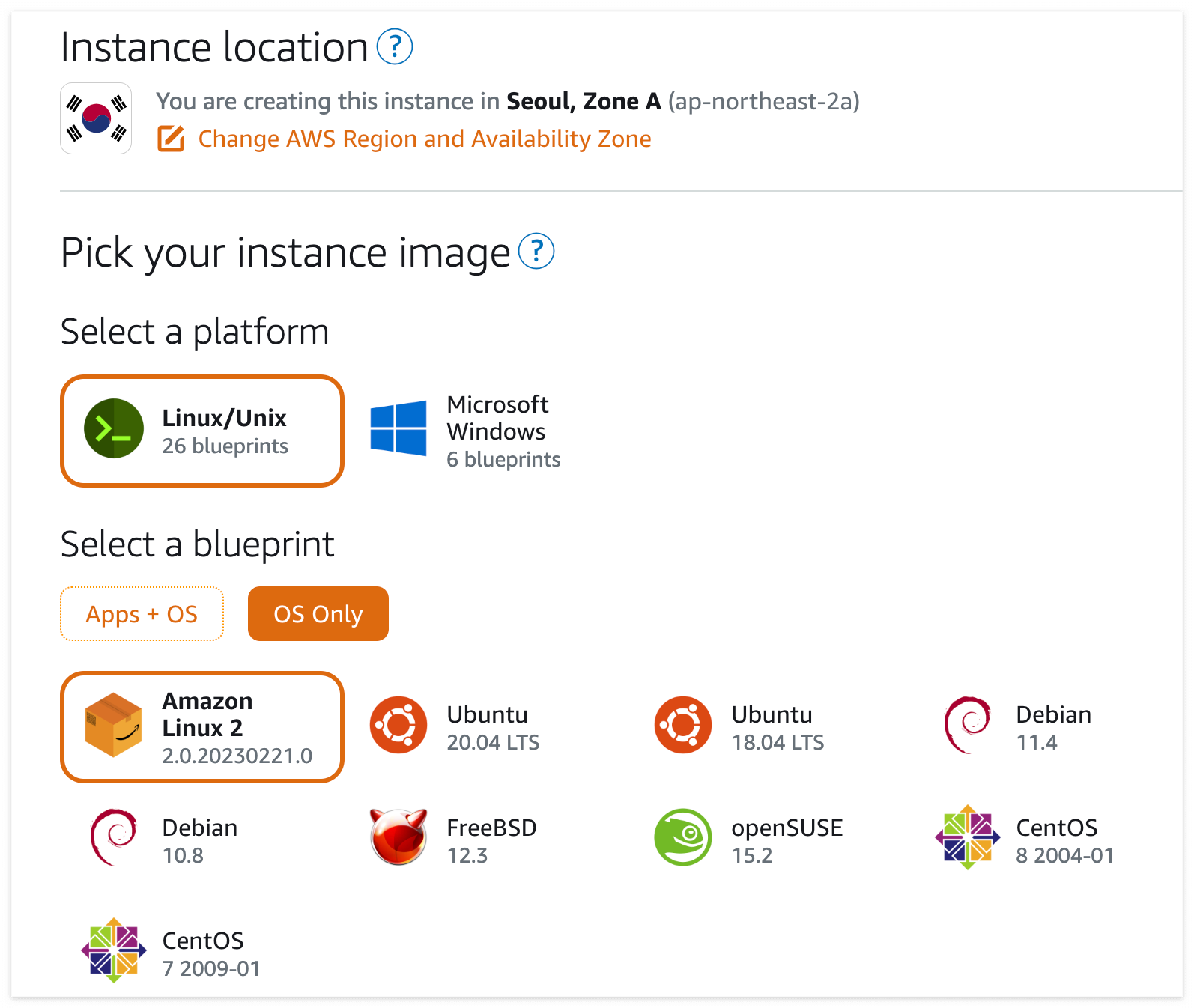 운영체제를 선택해야합니다. 저같은 경우는 OS Only로 Amazon Linux2 OS를 선택하였습니다.