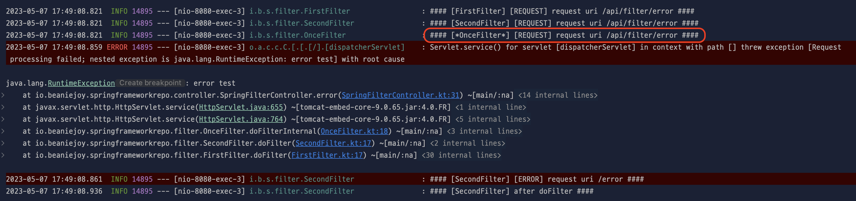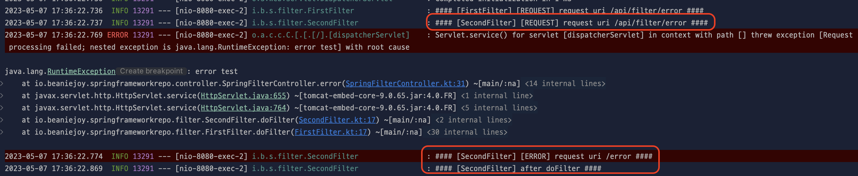 SecondFilter가 REQUEST 때 한 번 호출되고 Exception 발생 이후에 ERROR type으로 한 번 더 호출되는 것을 확인할 수 있습니다.
