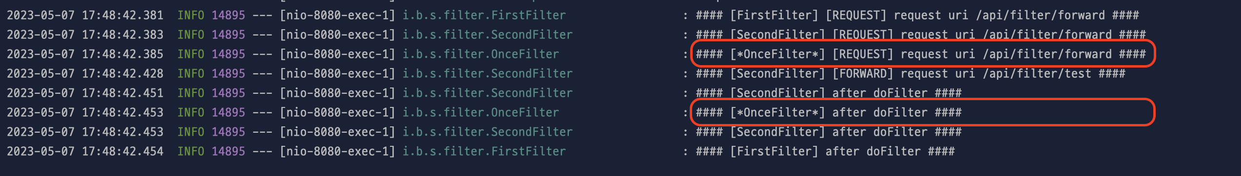SecondFilter와 똑같은 dispatcherType을 적용했음에도 forward, exception 발생상황에서 OncePerRequestFilter를 구현한 Filter는 한 번만 호출된 것을 확인했습니다.