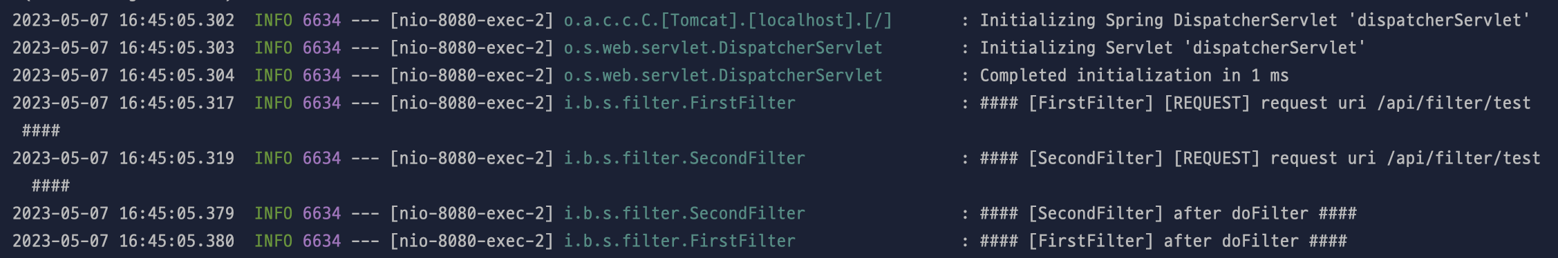 test api 호출시 request 유입에서는 config file에 적용했던 순서대로 FirstFilter > SecondFilter 순으로 호출이 되고 response 내보내는 과정에서는 반대로 SecondFilter > FirstFilter 순으로 호출되는 것을 확인할 수 있습니다.