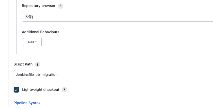 Script Path는 pipeline 빌드할 script의 위치를 설정하는 것인데요. 저는 Jenkinsfile script 파일 위치가 repository root path에 있기 때문에 단순히 파일명만 입력하였습니다.