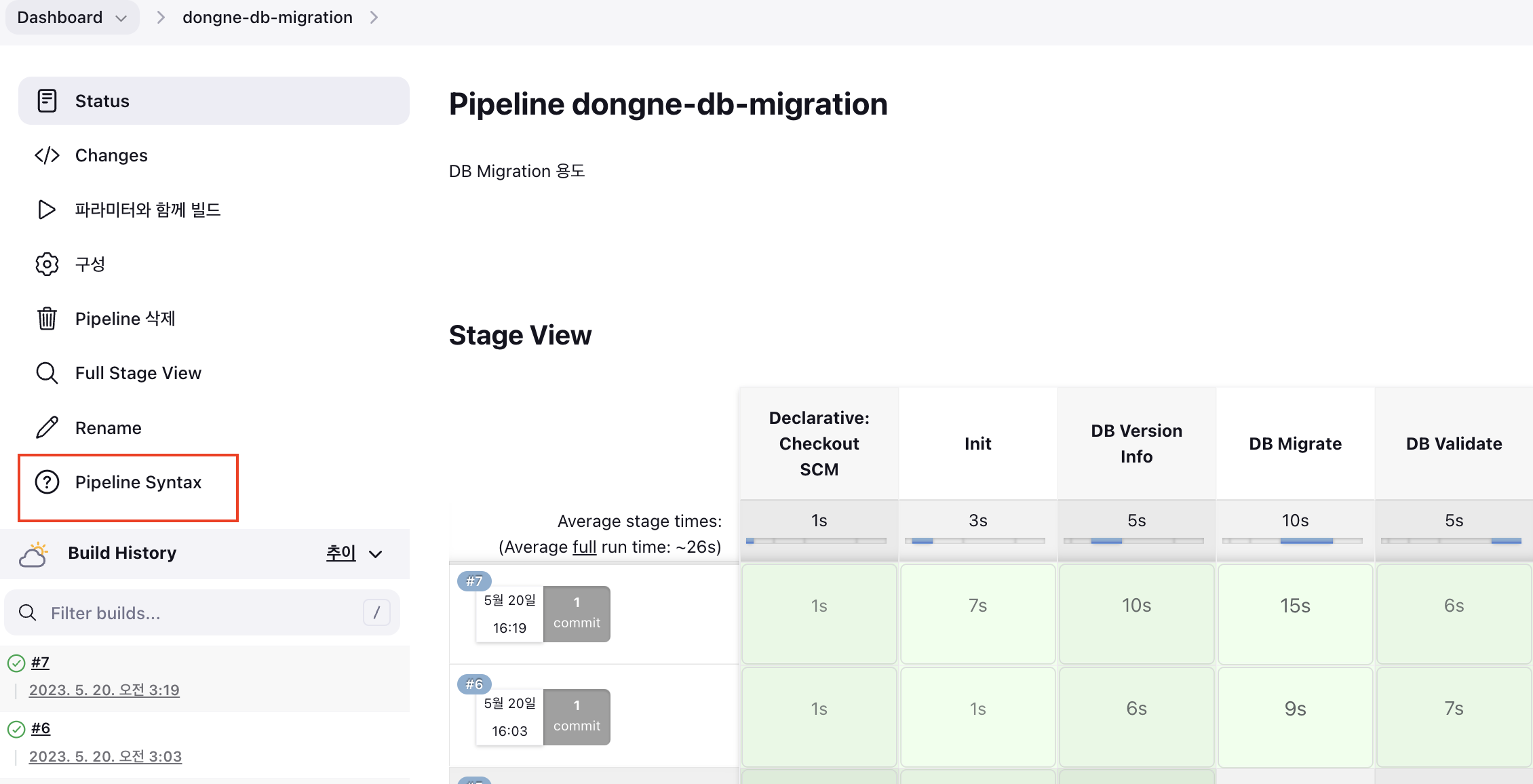 이를 통해 DB 테이블 구조 변경이 필요할 때 Jenkins에서 해당 pipeline item으로 먼저 migration 작업을 진행하고 실환경 나가기 전에 제대로 DB 수정이 이루어졌는지에 대해서 충분히 확인 및 검토할 수 있을 것이라 생각했습니다.