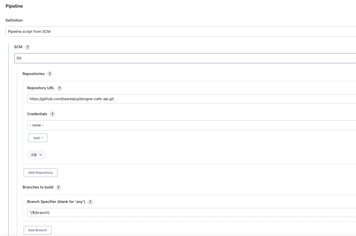 (여기서는 git repository 자체가 public 성격이라 따로 credentials 내용을 설정하지 않았습니다. 하지만 보통 실무에서는 private repository나 github enterprise 같은 구축형 플랫폼을 통해서 관리되기 때문에 거의 필수로 설정하고 있습니다.)